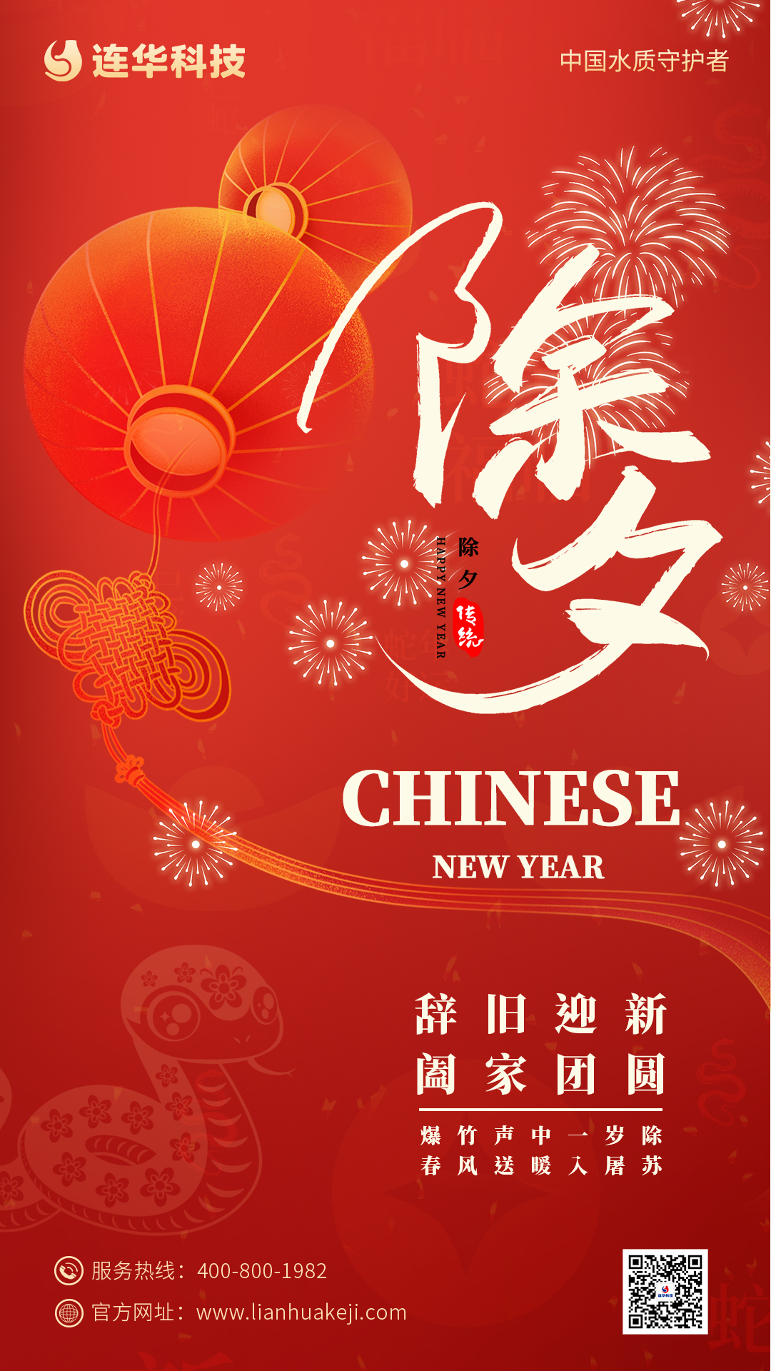 舊歲的余暉 漸漸隱沒于時光的幕后 新的一年 攜著新生的憧憬與希冀翩然而至 除夕佳節 連華科技全體員工恭祝大家 蛇來運轉巳巳好 心想事成步步高 家庭幸福美滿 生活平安喜樂