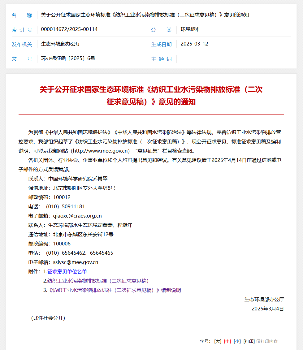 日前,為為貫徹《中華人民共和國(guó)環(huán)境保護(hù)法》《中華人民共和國(guó)水污染防治法》等法律法規(guī),完善紡織工業(yè)水污染物排放管控要求,生態(tài)環(huán)境部起草了《紡織工業(yè)水污染物排放標(biāo)準(zhǔn)(二次征求意見(jiàn)稿)》,現(xiàn)公開(kāi)征求意見(jiàn)。