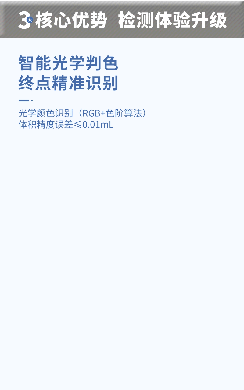 2、模擬人工自動進行滴定,內(nèi)置RGB模式算法、色階判斷,自動判斷滴定速度、終點,提高滴定效率;